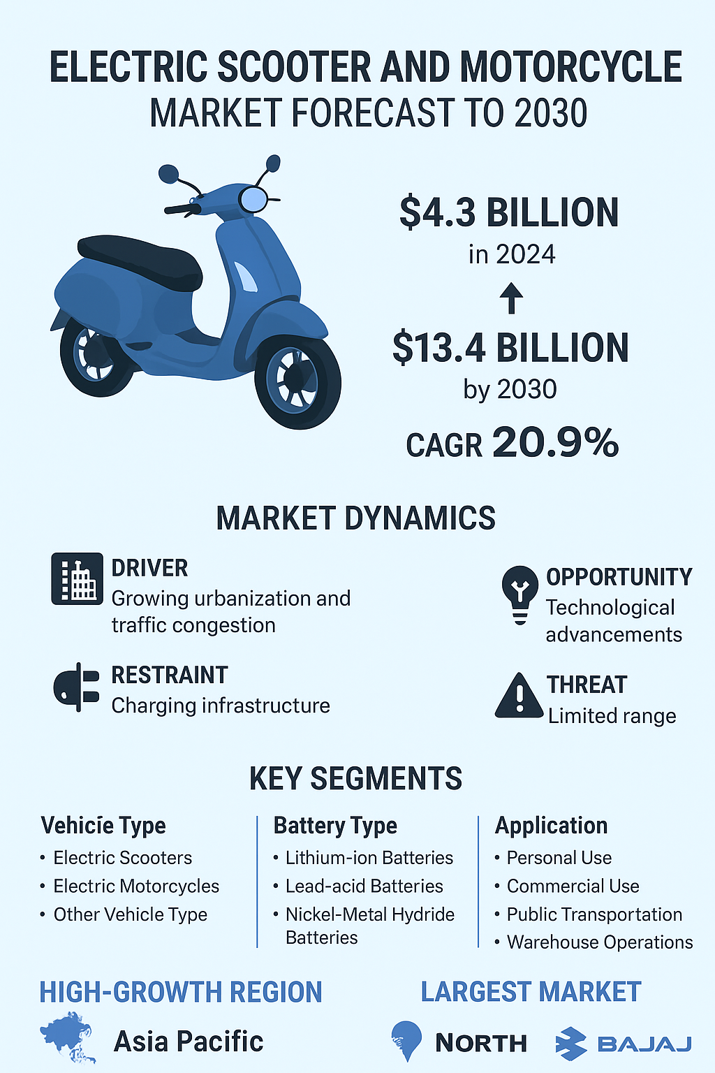 The global electric scooter and motorcycle market is on a steep growth trajectory. According to Stratistics MRC, the sector is expected to grow from $4.3 billion in 2024 to $13.4 billion by 2030, at an impressive CAGR of 20.9%.