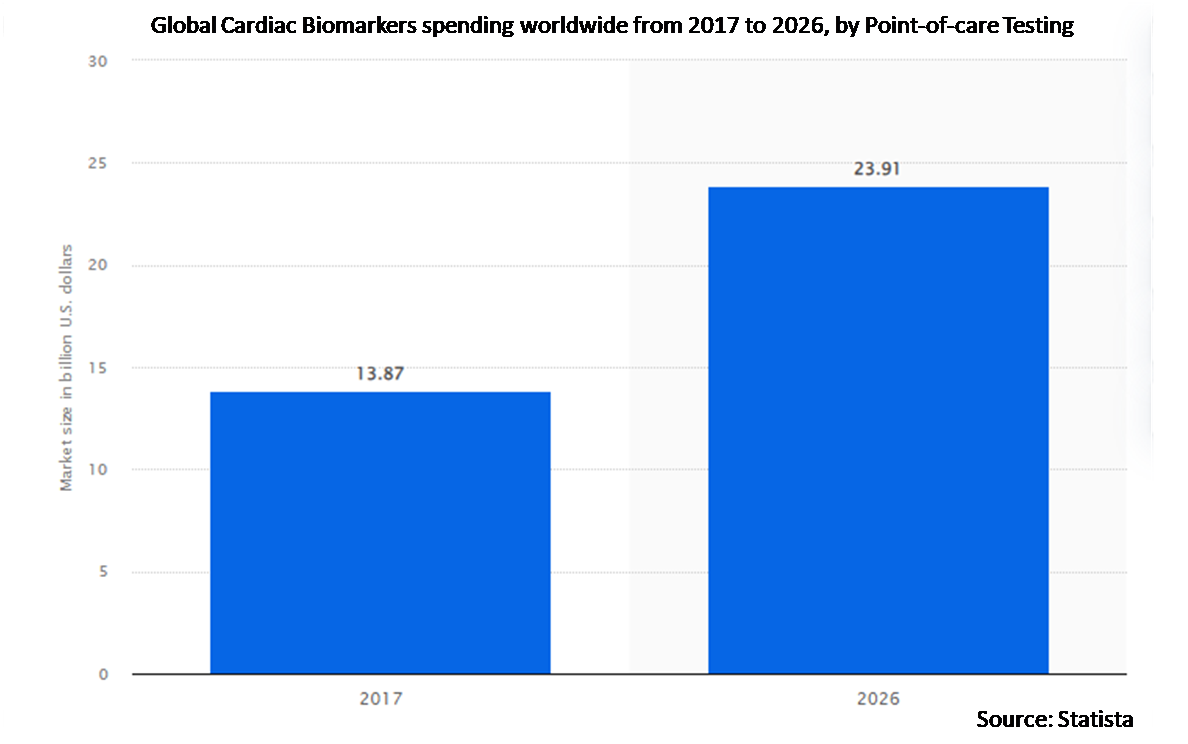 With an increasing global burden of heart-related conditions like heart attacks, heart failure and cardiac ischemia, there's a growing demand for reliable diagnostic tools. Cardiac biomarkers serve as vital indicators, aiding in the early detection, diagnosis, and prognosis of cardiovascular ailments. Their ability to accurately assess heart health, predict risks, and guide treatment strategies aligns with the pressing need for efficient, timely, and precise diagnostics in combating the rising incidence of cardiovascular diseases worldwide.