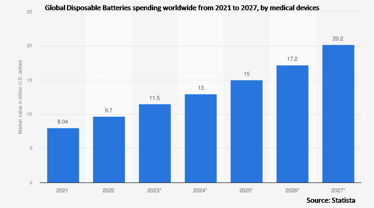 The demand for power sources has increased dramatically as people become more and more dependent on gadgets like laptops, tablets, smartphones, and cameras. For many applications, disposable batteries provide a dependable and portable solution, even if they are frequently less convenient than rechargeable ones. They are a popular option for powering a variety of consumer goods, from toys and remote controls to emergency lighting and medical equipment, because to their availability and affordability. Thus, the market disposable batteries are rising at a substantial rate.