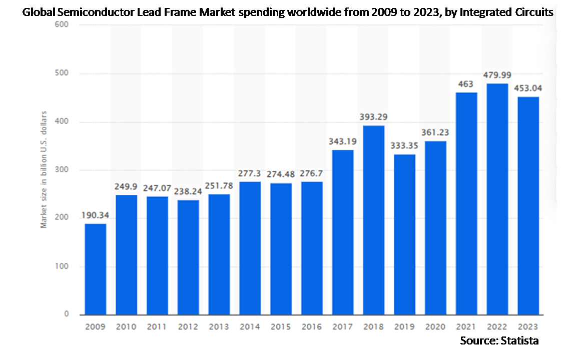 The global Semiconductor Lead Frame market expected to drive growth during the forecast period, due to increased demand for electronic devices and technological advancements, the global semiconductor market is expanding steadily. In Semiconductor a lead frame acts as a mediator between different materials and offers superior cooling and conductivity. Due to the need for lead frames in every semiconductor chip, this increase in semiconductor production presents opportunities for lead frame manufacturers.