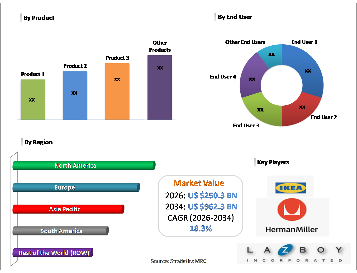 According to Stratistics MRC, the Global Space-Saving Smart Furniture Market is accounted for $250.3 billion in 2026 and is expected to reach $962.3 billion by 2034 growing at a CAGR of 18.3% during the forecast period. Space-saving smart furniture refers to innovative home furnishings designed to maximize living space while offering multifunctional features. Examples include foldable beds, modular sofas, and tables with hidden storage. Integrated with smart technology, these pieces often include sensors, automation, or connectivity to enhance convenience. They are particularly valuable in urban environments where living areas are smaller. The goal is to combine style, practicality, and technology to create adaptable furniture that improves comfort, organization, and efficiency in modern households without compromising aesthetics or usability.